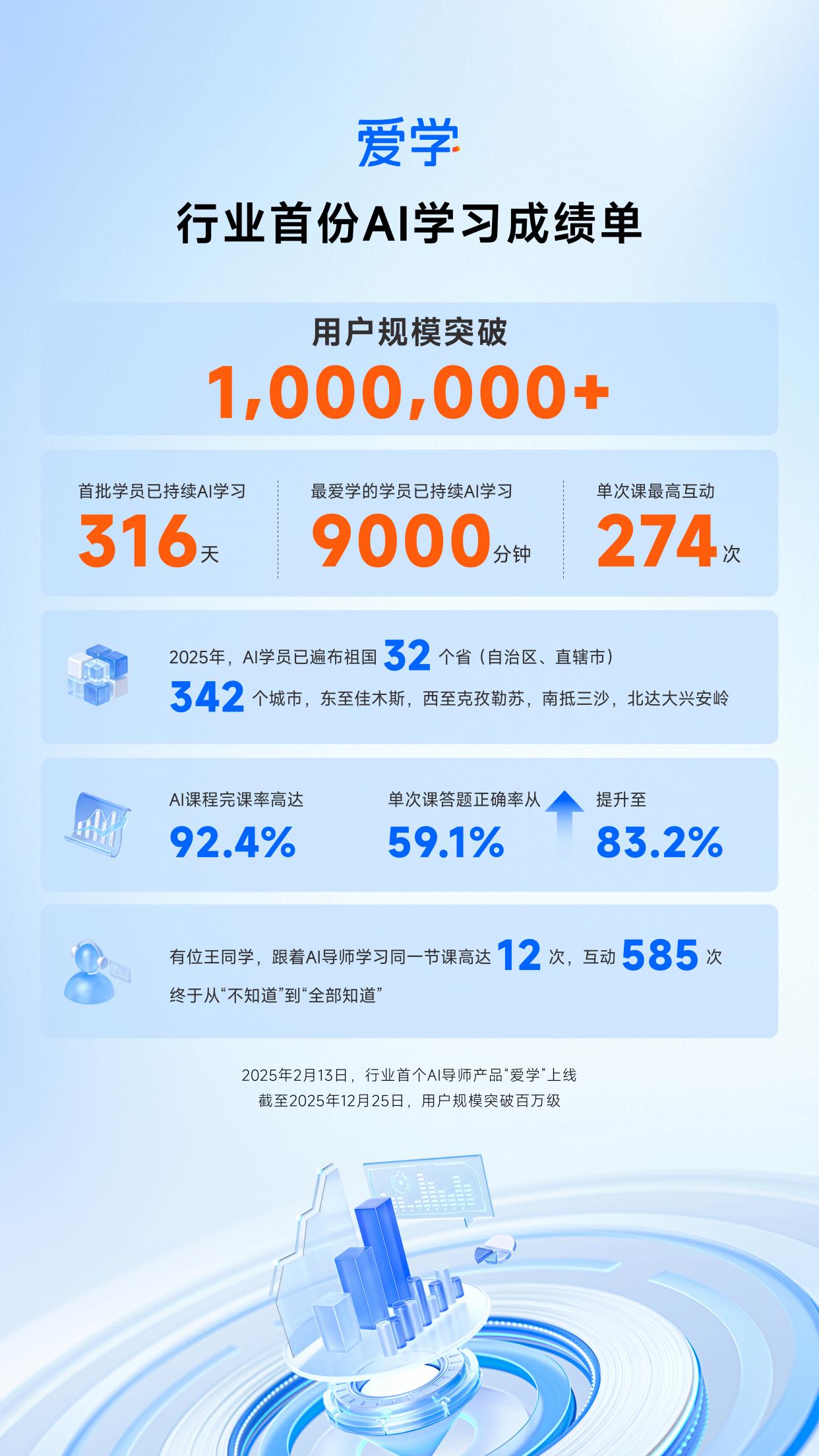 根据官方披露的数据,爱学真人级AI导师推出近一年,教出的首批AI学习原住民已达百万规模,遍布全个省(自治区、直辖市)、342个城市,东至佳木斯,西至克孜勒苏,南抵三沙,北达大兴安岭。学员持续学习天,单个学员最长学习记录分钟。更值得关注的是其显著的教学效果:单次课最高互动次,完课率高.4%,学员单课答题正确率从不%提升至超%,部分课程正确率超%。